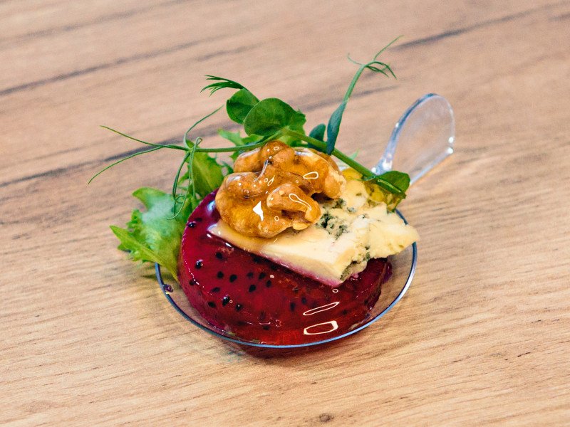 Питахая, сыр дор блю, грецкий орех, мёд, салат фрилист, микрозелень