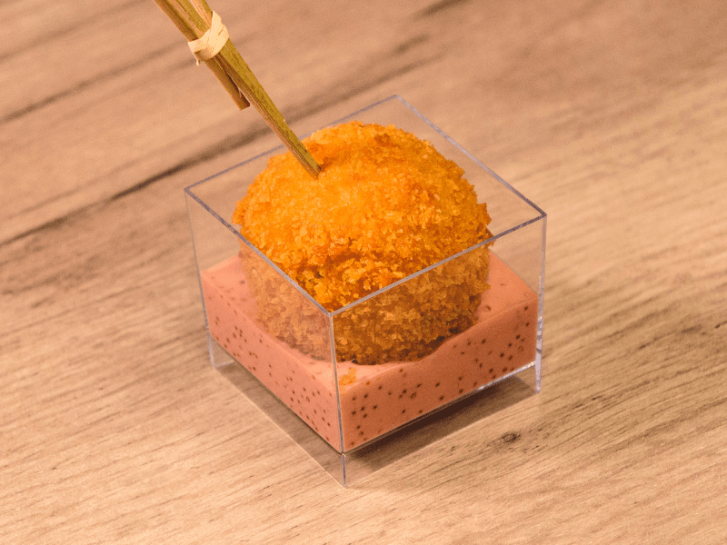 Гребешки морские, сыр творожный, сыр парезан,яйцо, панировочные суари, яйцо, соус масаро с икрой летучей рыбы (продажа от 7шт)