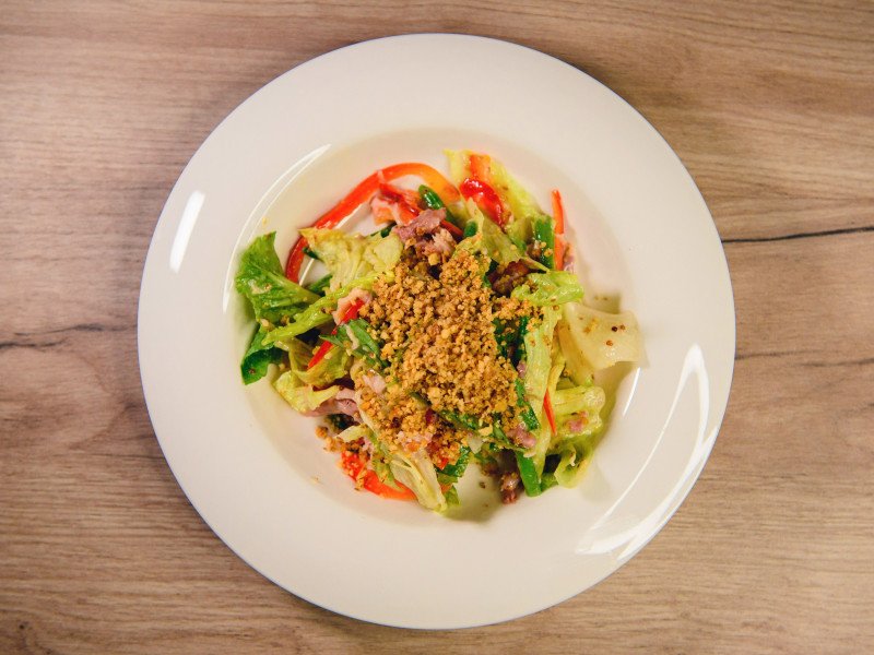 Микс-салат: листья романо и айсбер, копчёное мясо: курица, утка, индейка, болгарский перец, кенийская фасоль, медово-горчичная заправка и грецкий орех