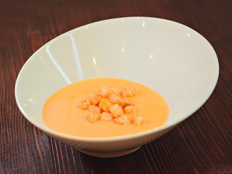 Сыр чедер, сливки, лук, картофель, морковь. Подается с гренками