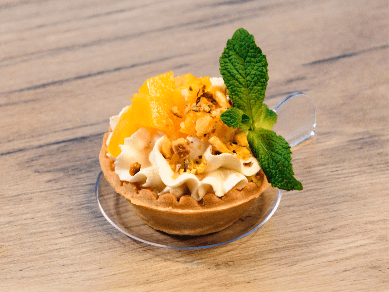 Тарталетка, манго, лосось слабо-солёный, фисташки, соус маракуйя, крем сырно- творожный, мята