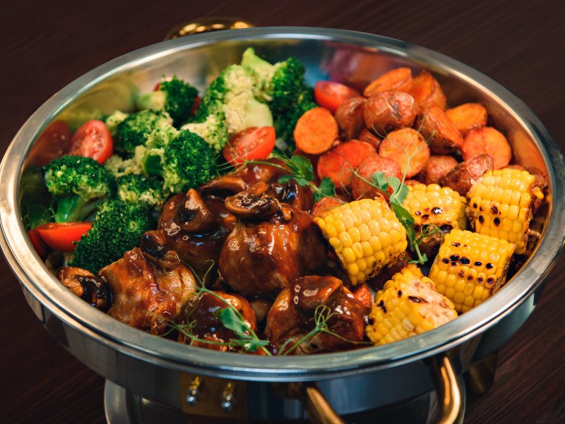 Вырезка свиная завернутая в бекон, брокколи, кукуруза в початках , картофель по деревенски, соус мясной с шампиньонами, помидоры черри , зелень